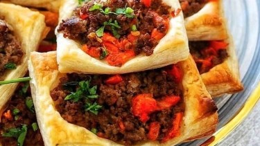 Hojaldres rellenos de carne salteada, con tomates cherry y morrones