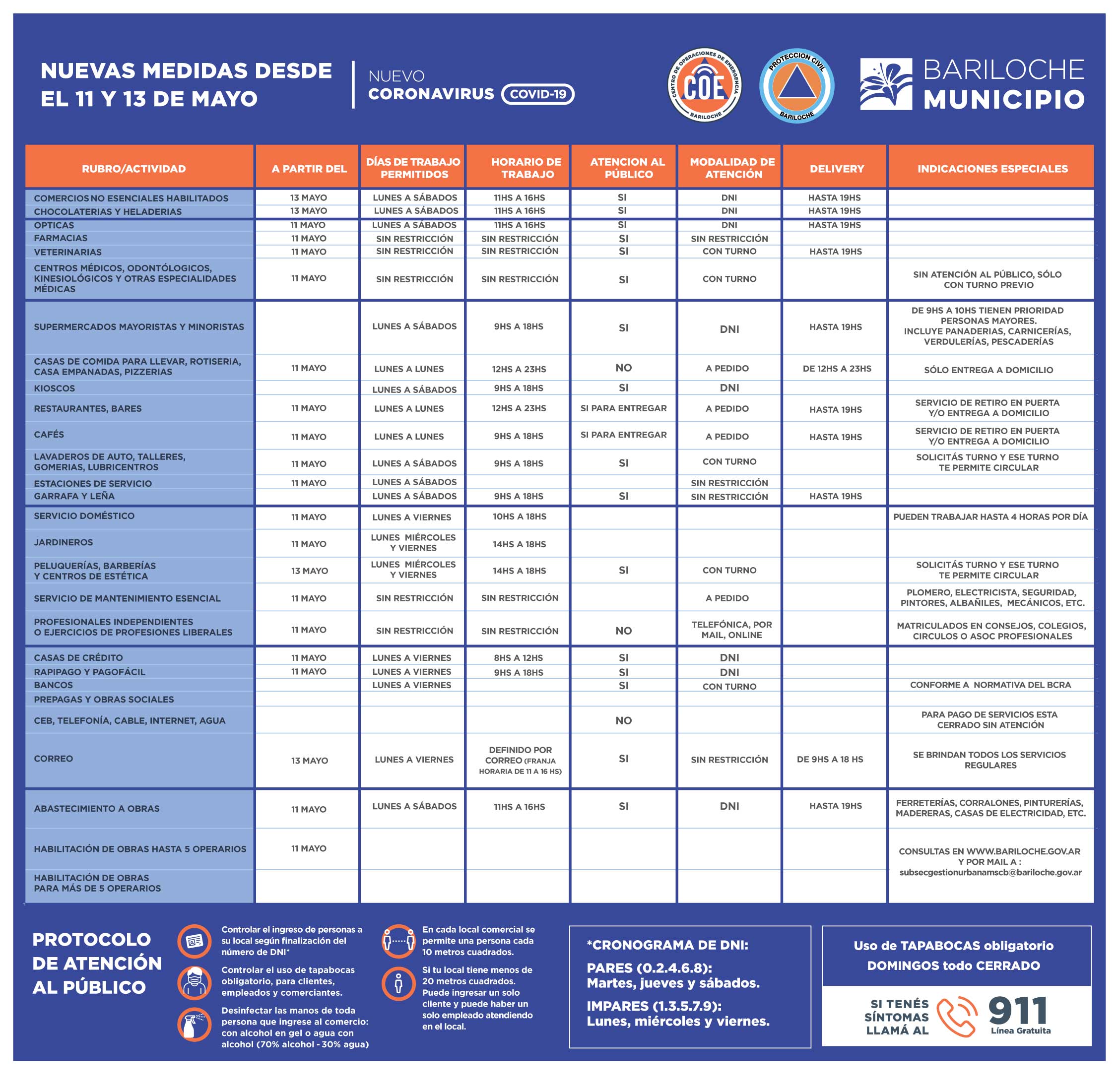 Además, es obligatorio el uso de tapabocas para el personal y clientes y en el caso de empleados del comercio deberán ademas utilizar una máscara de protección. En ningún caso se podrá atender personas consideradas de grupos de riesgo (embarazadas, adultos mayores, niños menores de un año).