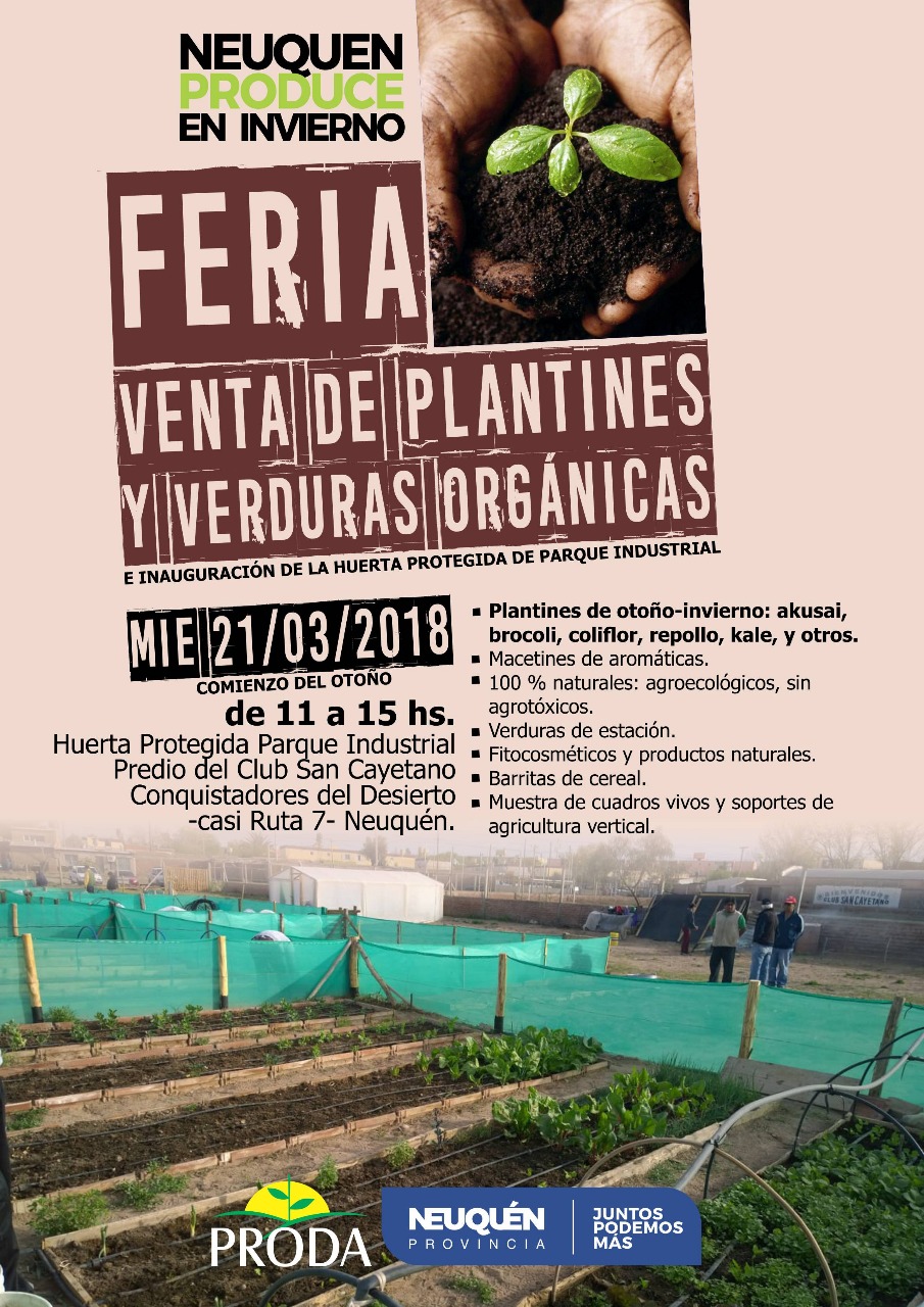 El acto de inauguración de la nueva huerta protegida de Parque Industrial, en Neuquén, se realizará este miércoles 21 de marzo, desde las 11hs, en la misma huerta. Se encuentra ubicada en el Club San Cayetano, calle Conquistadores del Desierto, casi Ruta 7.