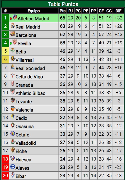 La liga de España vive momentos decisivos, ya que la ventaja que llevaba el Atlético en lo más alto de la tabla se fue achicando. A tal punto que, con este resultado, si mañana gana Barcelona (juega contra Valladolid) quedaría a un punto. Sevilla llegó a 58 puntos y está cuarto.