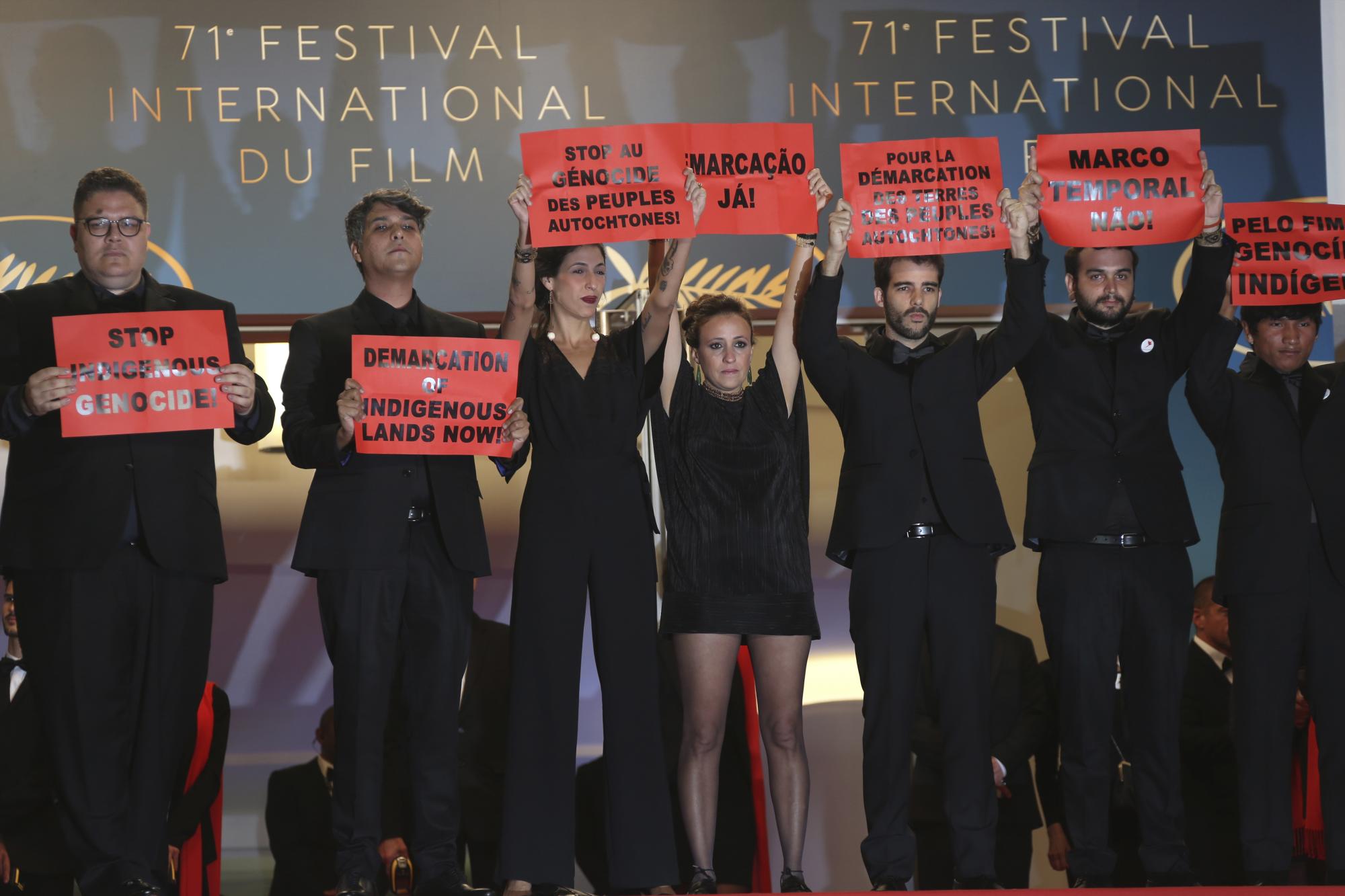 Normalmente está prohibida cualquier manifestación de orden político o religioso en la alfombra roja. Lo que no impidió que el equipo del filme “Chuva e Cantoria na Aldeia dos Mortos”, de la brasileña Renée Nader Messora y del portugués Joao Salaviza, mostrara carteles contra el “genocidio de los indígenas” en Brasil.