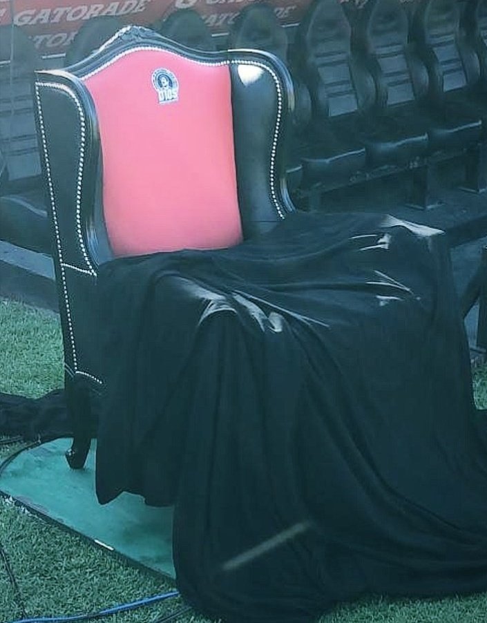 El último obsequio que recibió Maradona antes del comienzo del partido, fue un sillón con su nombre que se ubicó junto al banco de suplentes visitante. Desde allí Diego vive el encuentro de su equipo ante la Lepra.