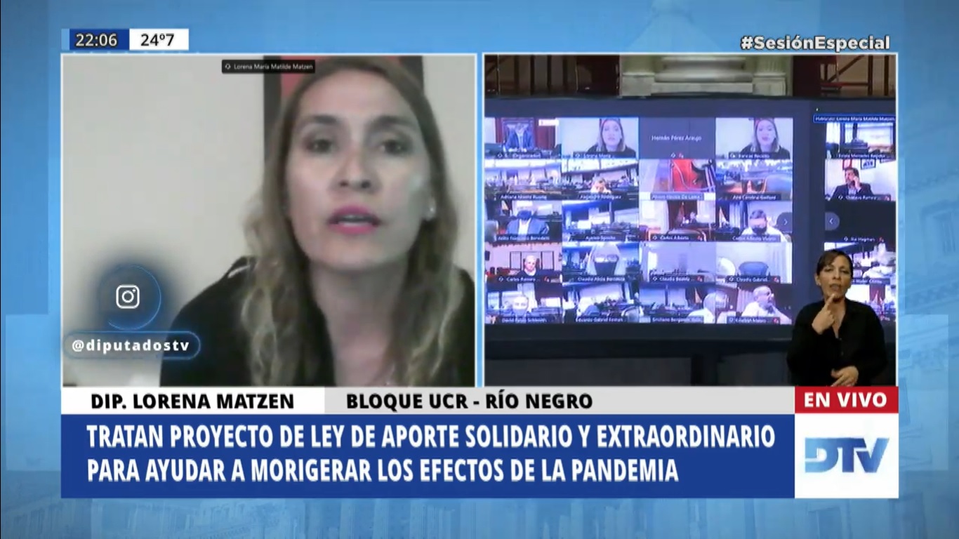 La diputada radical por la provincia de Río Negro, Lorena Matzen, señaló hoy durante la sesión que debate el proyecto de Aporte Solidario y Extarordinario a las grandes fortunas que se trata de «un nuevo relato» y manifestó su oposición.