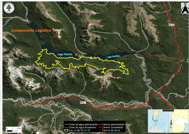Una cuadrilla trabajó en el «istmo» entre los lagos Martin y Steffen, por ambos lados, desarrollando tareas que eviten que el fuego salte hacia la costa del lago Steffen.