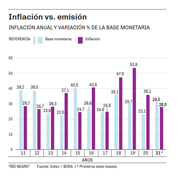 - El crecimiento de la base monetaria en 2019, el año de mayor inflación en 28 años.