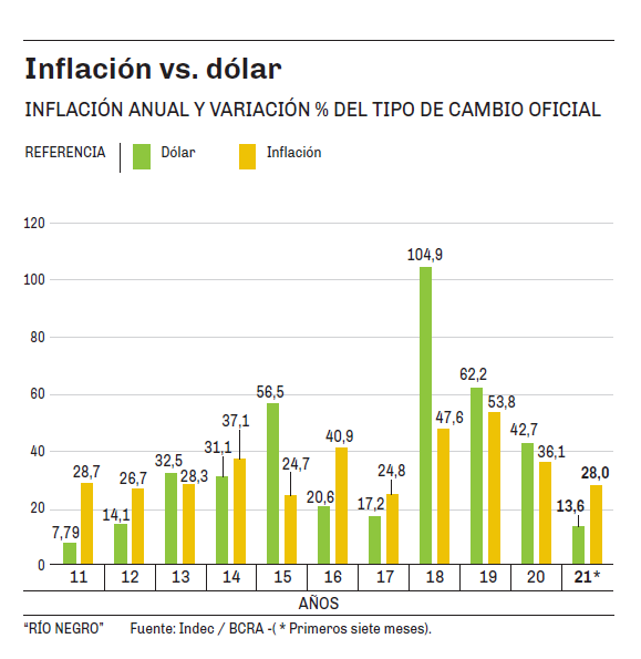 El segundo gráfico, arroja luz sobre uno de los elementos que en los últimos años ha motorizado la dinámica de precios: el dólar. Los datos revelan que a un año en que se registra una fuerte devaluación, le sigue un año de alta inflación. Así se verifica en 2015 (devaluación de 56,5%) y 2016 (inflación del 40,9%), o en 2018 (devaluación del 104,9%) y 2019 (inflación de 53,8%).