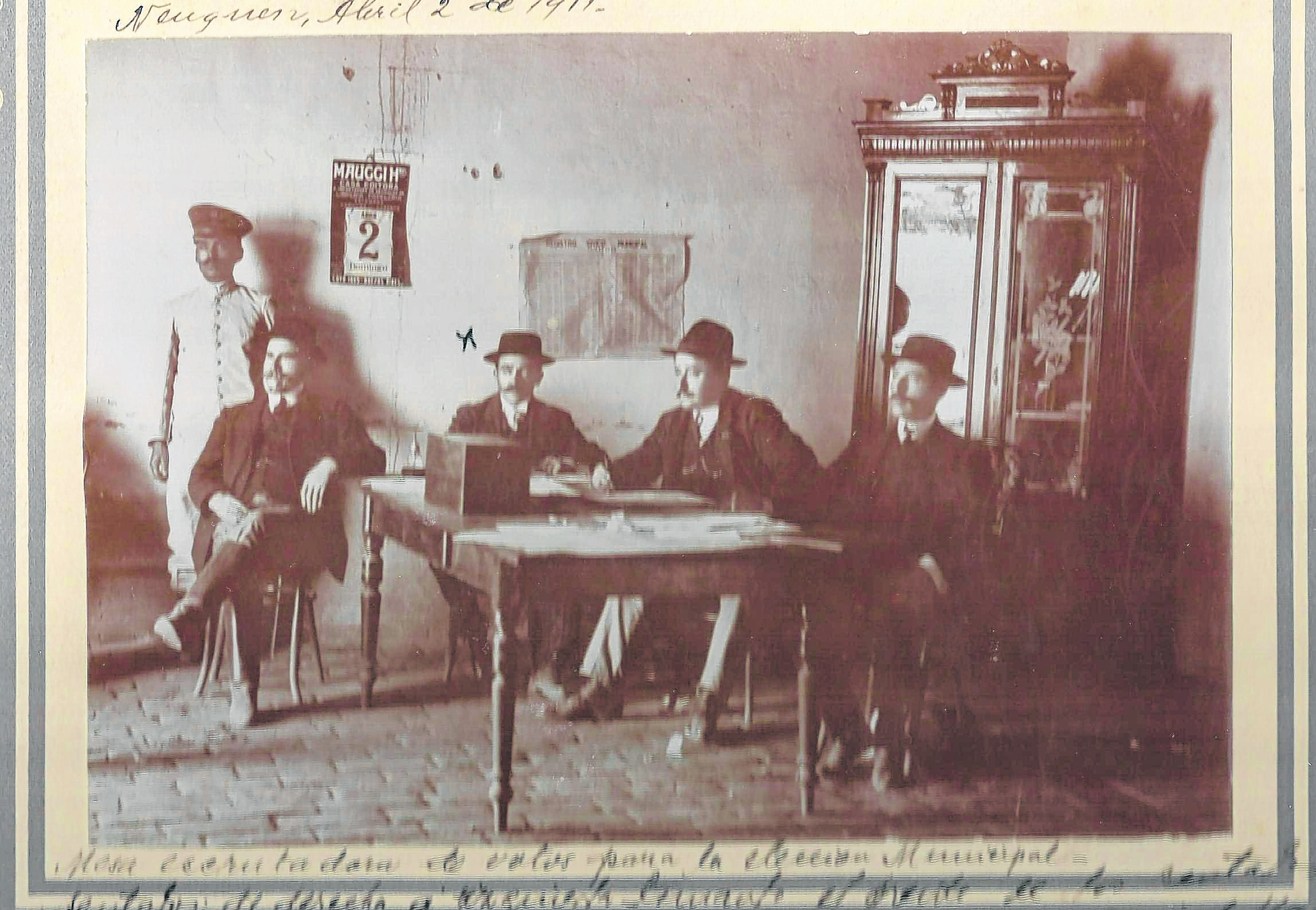 Mesa receptora de votos en una elección Municipal: allí están el señor Carazo, Arsenio Martín, Miguel Mango y, de pie, el Sargento Ricardo Guzmán, que custodió el tesoro provincial en el traslado capitalino.