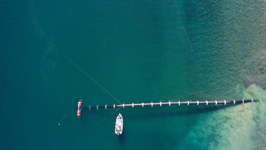 Un enorme ducto de 800 metros de largo quedó instalado en el lago Nahuel Huapi para emitir los efluentes tratados de la nueva planta depuradora de Bariloche, que está en la etapa final de su construcción.