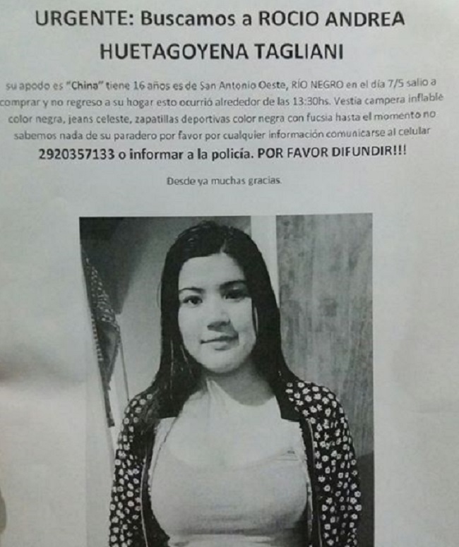 Intensa búsqueda de Rocío Andrea Huetagoyena Tagliani de 16 años. Desde la Fiscalía se informó que se continúa trabajando para dar con el paradero de esta jovencita de San Antonio Oeste, quien falta de su hogar desde el domingo pasado al mediodía.