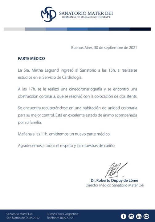 A través de una comunicación oficial, las autoridades del sanatorio indicaron que sobre las 17 «se le realizó una cinecoronariografía encontrándose una obstrucción coronaria, que se resolvió con la colocación de dos stents».