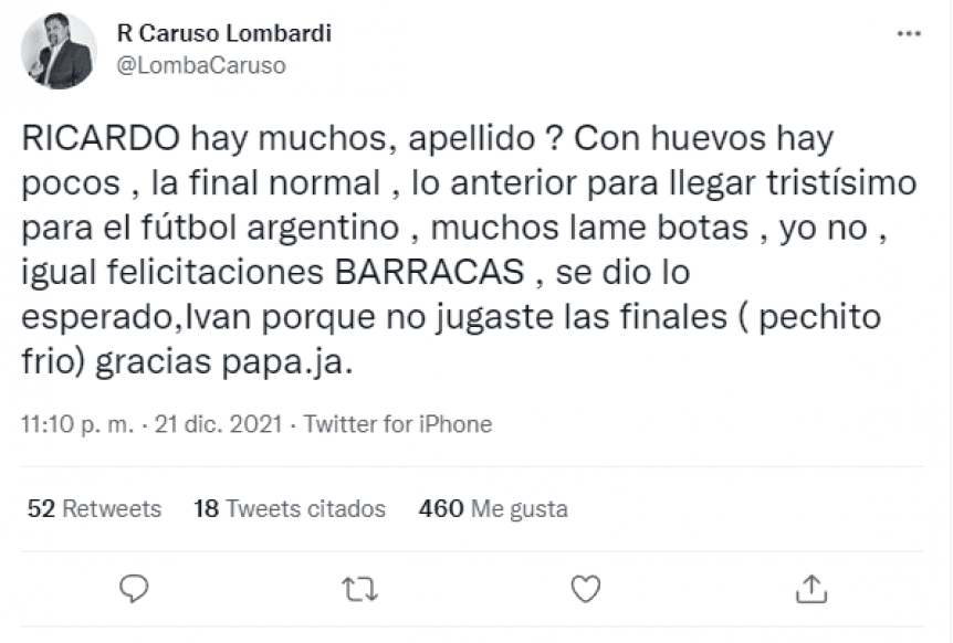 “Iván, ¿por qué no jugaste las finales (pechito frío)? Gracias papá, ja”, escribió el técnico en su cuenta personal de Twitter después de escuchar las declaraciones del 10 de Barracas que realizó en medio del festejo.