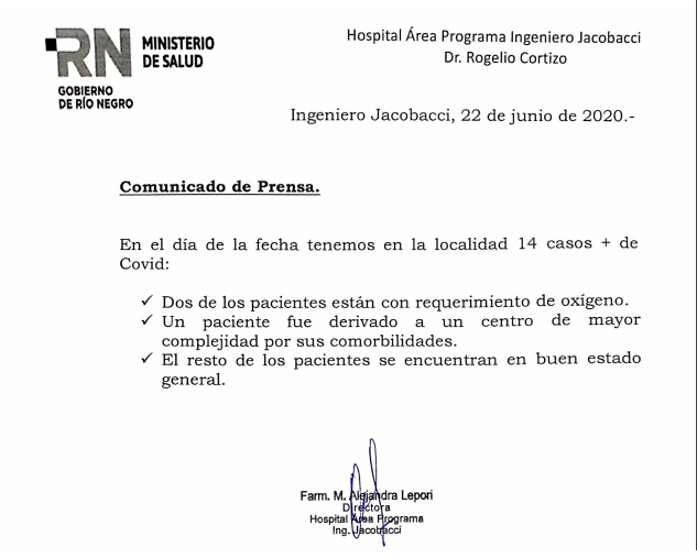 La ciudad tiene 14 casos activos. Anoche se derivó un paciente a Bariloche y a partir de hoy otros dos comenzaron a ser asistidos con oxigeno. El resto se encuentra en buen estado de salud.