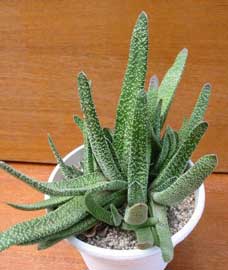 Gasteria Branchypylla: Originaria de Sudáfrica, es una suculenta que crece en forma de roseta hasta los 40 o 45 cm. Sus hojas crecen en línea recta y en primavera pueden florecer con un tallo con flores tubulares y colgantes.