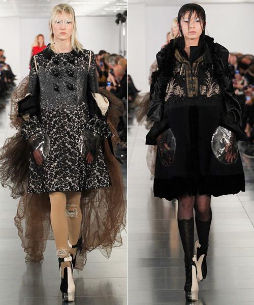Abrigos con línea trapecio que llevan bolsillos de plástico transparente, y en la misma silueta salen vestidos con escote palabra de honor y aplicaciones que parecen enormes ojos con pestañas XXL, detallles de un surrealismo que Margiela ha utilizado en sus últimas colecciones.