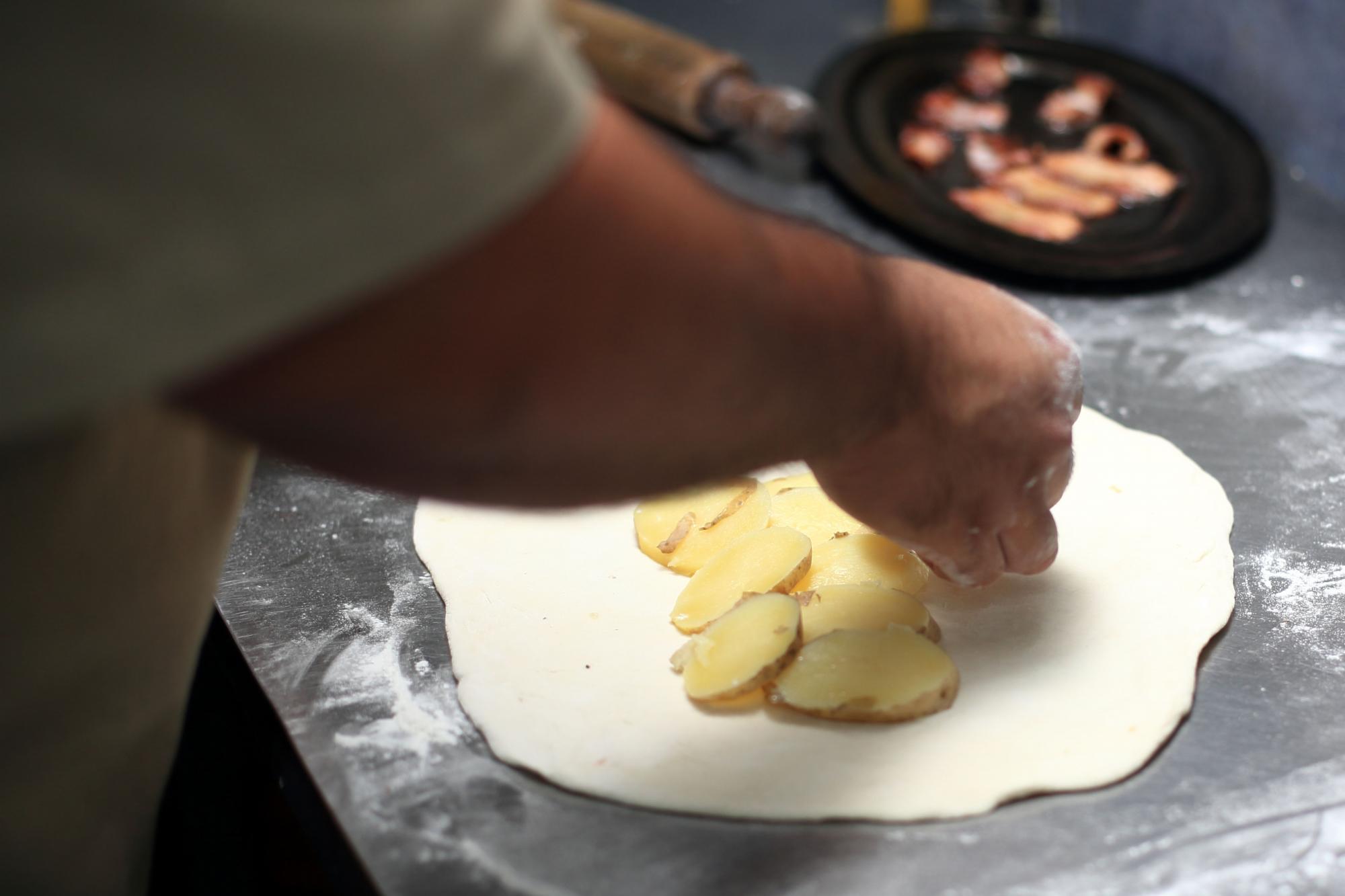 Noches atrás lo entrevistamos en su lugar de trabajo, en una noche bien fresquita que se prestaba para comer un lomo embuchado crocante al horno de barro. “Elegí un lomo de ternera patagónica, de una cabaña chica de Río Colorado. Lo envolví en una masa de doble fermentación, con queso de cabra y vegetales. El relleno varía según el producto fresco de mercado. Todo esto lo llevé al horno de barro y acá está”.