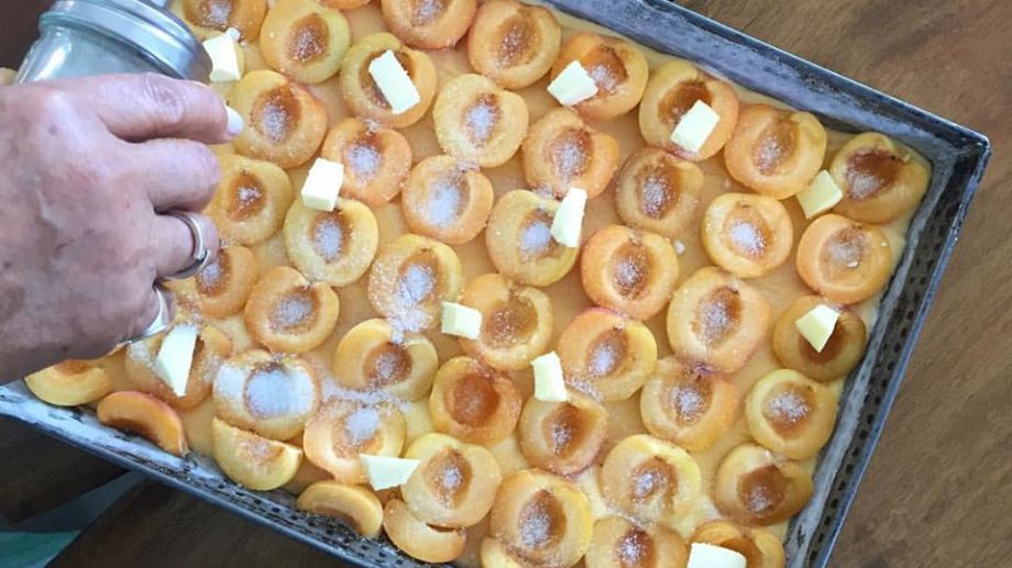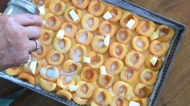 Batir los ingredientes hasta que de como resultado una mezcla bien cremosa. Colocar en una fuente o placa y por arriba poner damascos en mitades con un poquito de azúcar y manteca.