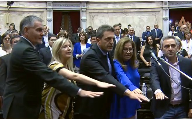 Massa fue uno de los primeros en jurar, en medio de vítores de sus pares, y lo hizo en forma paradójica, junto a la legisladora de Consenso Federal Graciela Camaño, con quien mantuvo una alianza hasta hace meses; luego se cruzarían en un fuerte abrazo. Máximo Kirchner sorprendió a más de uno con su juramento: «Juro por la Patria, por este día y en este día, sí, juro».