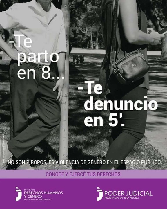 En ese sentido, esta semana se conoció una fuerte campaña en las redes sociales con información sobre la violencia laboral, el derecho a exigir licencia y sobre la violencia de género en el espacio público. En uno de los mensajes, el más llamativo, se observa como un hombre le dice a una mujer “te parto en 8” y ella le responde “te denuncio en 5”. Allí se explica y se invita a denunciar este tipo de situaciones.