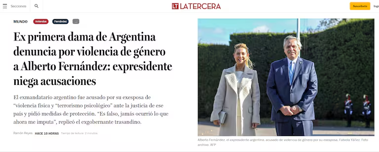 “El expresidente argentino Fernández niega acusaciones de violencia machista de su expareja”, titula el diario peruano El Comercio. Además de explicar el comunicado del expresidente en el que indica que los hechos por los que se lo acusa son falsos, la publicación también hace un breve recorrido sobre la relación del político y la periodista y actriz.