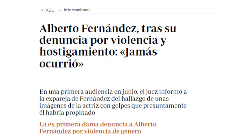 Su par nacional, el diario ABC, también hace referencia a las declaraciones del expresidente tras la denuncia de Yañez y titula la publicación con una contundente cita textual de Fernández: “Jamás ocurrió”.