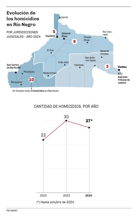 Mientras que en la Segunda Circunscripción Judicial, cuya cabecera es Roca, se registraron hasta el momento nueve crímenes. Luego, viene la Cuarta, con sede en Cipolletti, con cinco (el caso último ocurrió el domingo) y en la Primera Circunscripción, con Viedma como cabecera, hubo hasta ahora tres crímenes.