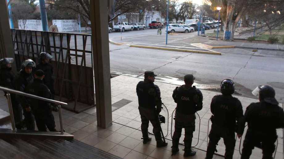 Con vallas y custodia permanente, el edificio del Tribunal Oral Federal de Roca comienza a rodearse nuevamente por efectivos de fuerzas de seguridad este martes, en la quinta audiencia del juicio por el homicidio de Rafael Nahuel.