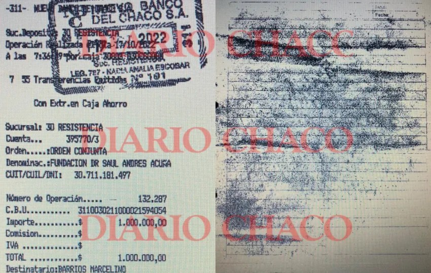 Un ticket con una extracción bancaria hecha por Marcelino Barrios de un millón de pesos desde el Banco del Chaco el 17 de octubre del año pasado. Los beneficiarios eran nada más y nada menos que Emerenciano Sena y su mujer Marcela Acuña.