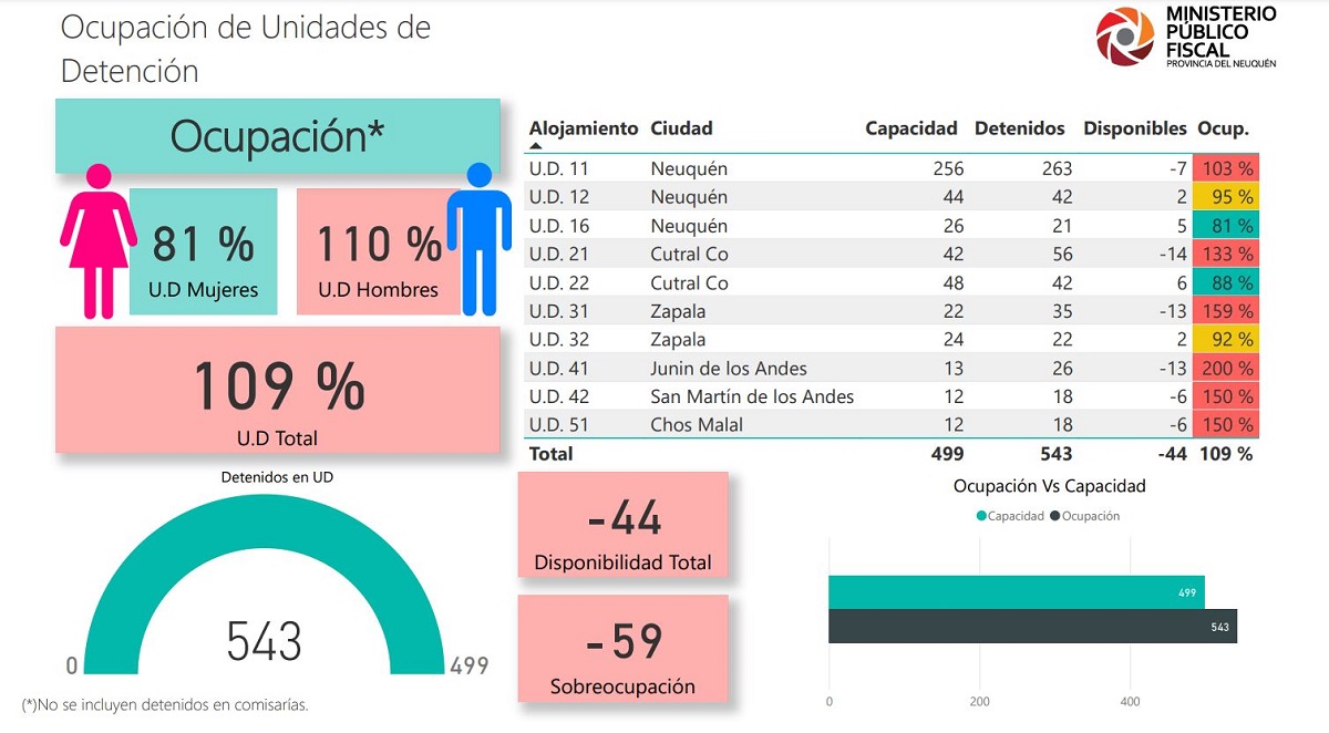 El total de personas privadas de su libertad en toda la provincia de Neuquén asciende a 595. De ellas, 543 están en unidades de detención.