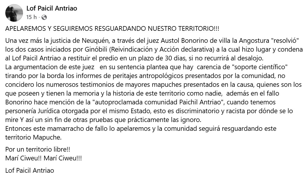 «La argumentación de este juez en su sentencia plantea que hay carencia de ´soporte científico´ tirando por la borda los informes de peritajes antropológicos presentados por la comunidad, no consideró los numerosos testimonios de mayores mapuches presentados en la causa, quienes son los que poseen y tienen la memoria y la historia de este territorio como nadie, además en el fallo Bonorino hace mención de la ‘autoproclamada comunidad Paichil Antriao´, cuando tenemos personería jurídica otorgada por el mismo Estado, esto es discriminatorio y racista por dónde se lo mire. Y así un sin fin de otras pruebas que prácticamente las ignoró», señalaron en un comunicado.