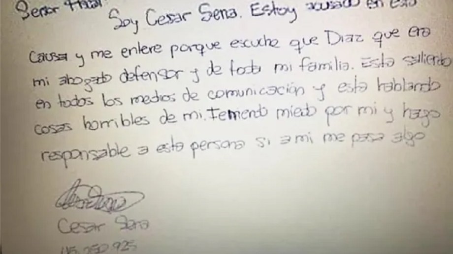 “Señor Fiscal: soy César Sena. Estoy acusado en esta causa y me enteré porque escuché que (Juan) Díaz (su exabogado) que era mi abogado defensor y de toda mi familia está saliendo en todos los medios de comunicación y está hablando cosas horribles de mí”, arranca la misiva difundida por TN.
