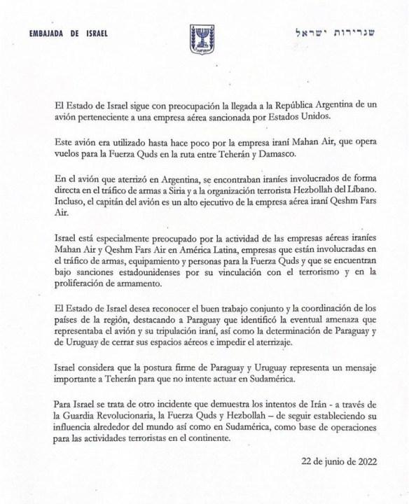 Este miércoles, en la carta de la embajada israelí en Paraguay, se aseguró que «en el avión que aterrizó en Argentina, se encontraban iranies involucrados de forma directa en el tráfico de armas a Siria y a la organización terrorista Hezbollah del Libano. Incluso, el capitán del avión es un alto ejecutivo de la empresa aérea iraní Qeshm Fars Air».