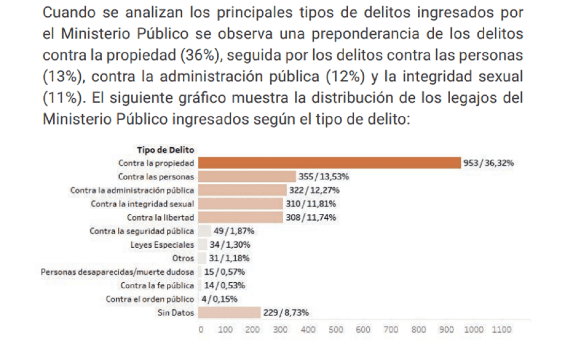 Después están los delitos contra la administración pública con un 12,27%, que incluye el atentado y resistencia a la autoridad, la falsa denuncia, el falso testimonio, el encubrimiento y la desobediencia a una orden judicial que, entre otros legajos, se aplica ante el incumplimiento de medidas cautelares en violencia de género.