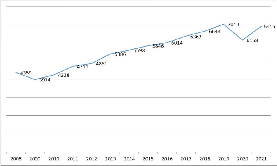Del piso de 3.974 casos ingresados en 2009, se llega al pico de 6.915 en 2021, como refleja el siguiente gráfico.