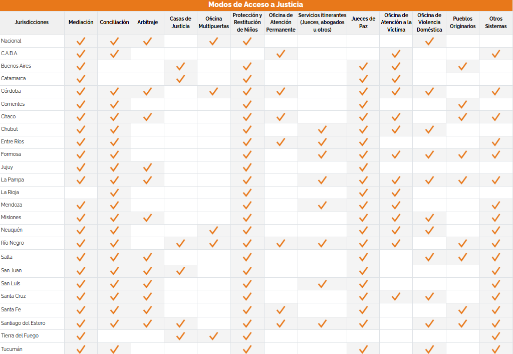 El informe de la Corte Suprema señala que los mecanismos más extendidos a nivel nacional son la protección y restitución de niños, la mediación y los jueces de paz, presentes en más de 21 provincias.