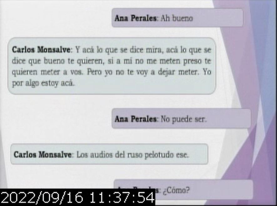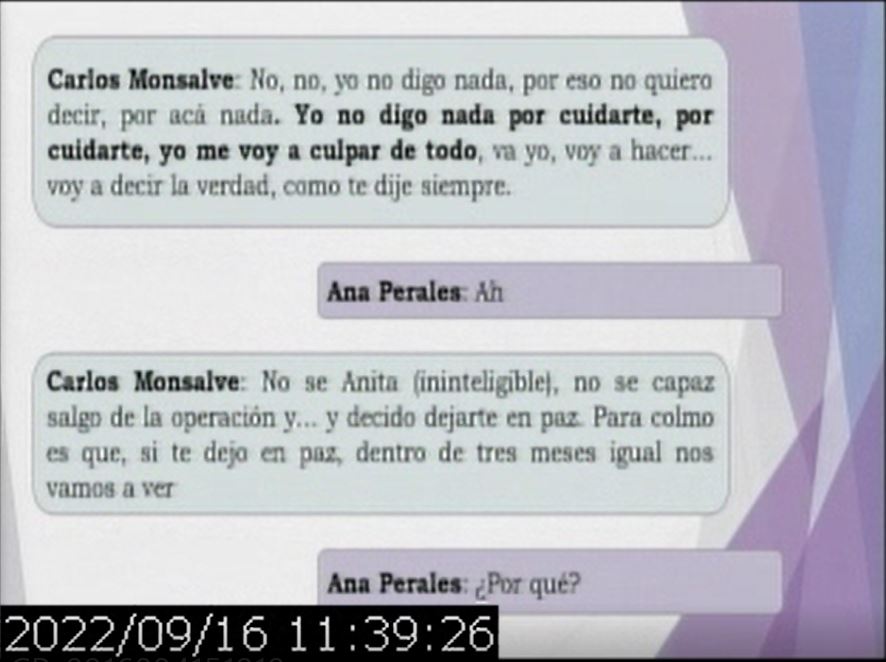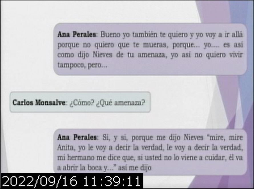 En la audiencia del viernes, una perito reprodujo los audios que la comprometen. Se trata de intervenciones telefónicas, que registran conversaciones entre Ana Perales y Nieves, la hermana de Monsalve ya fallecida, y entre Perales y Monsalve.