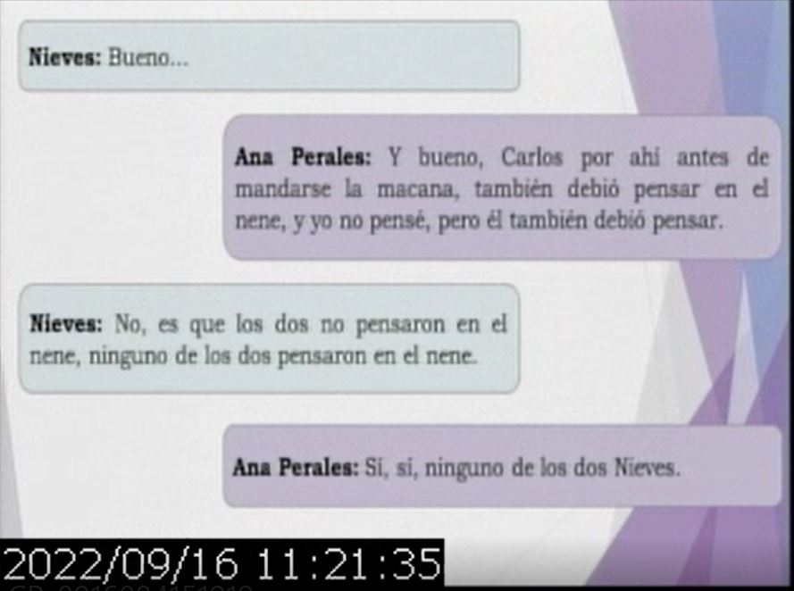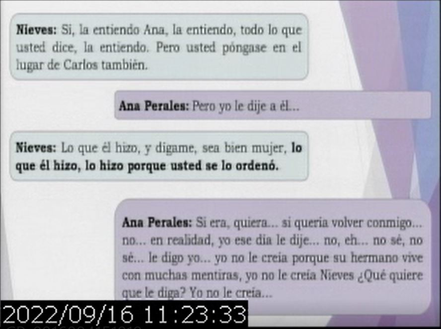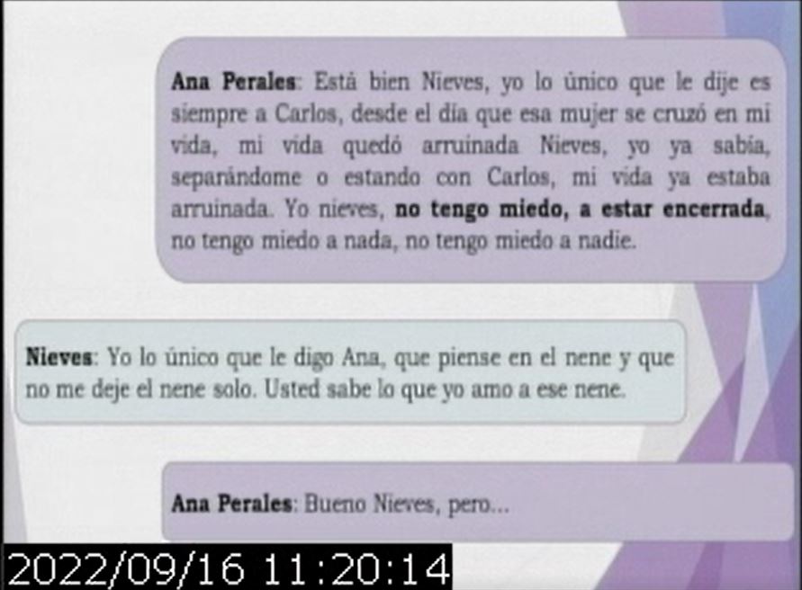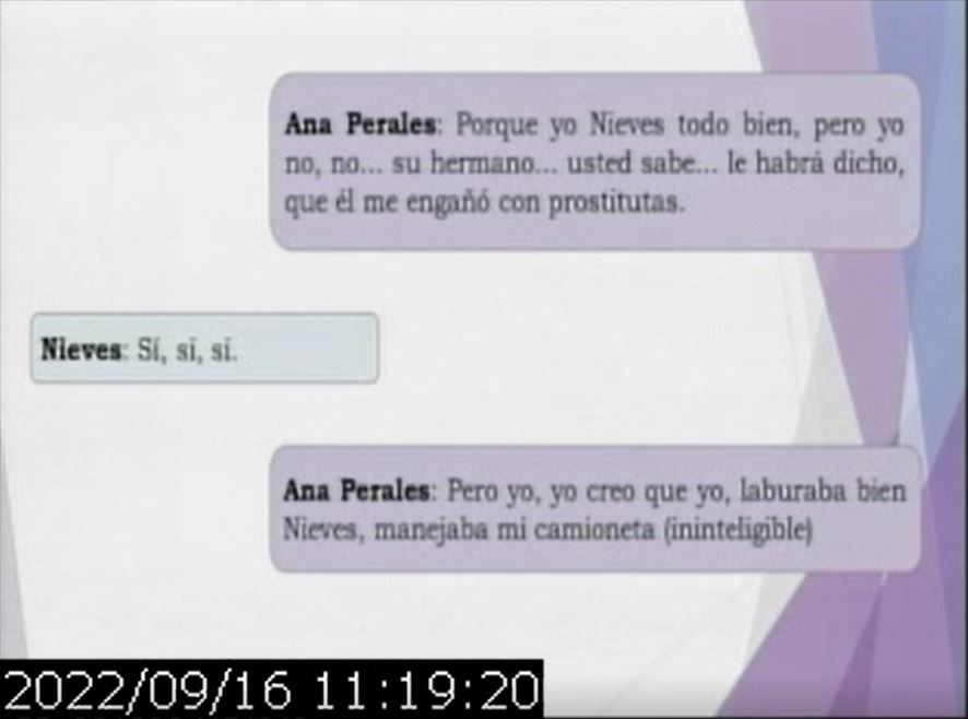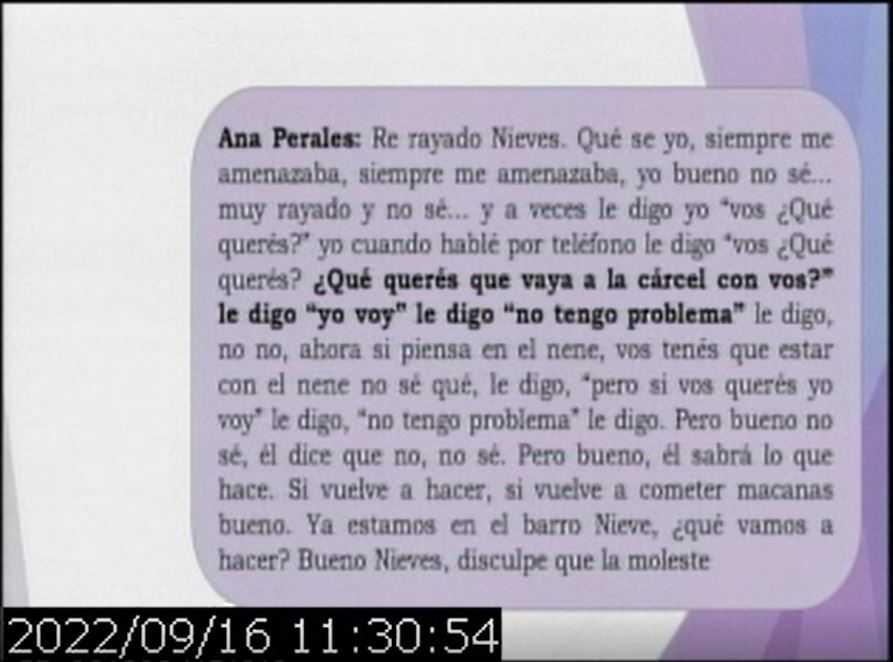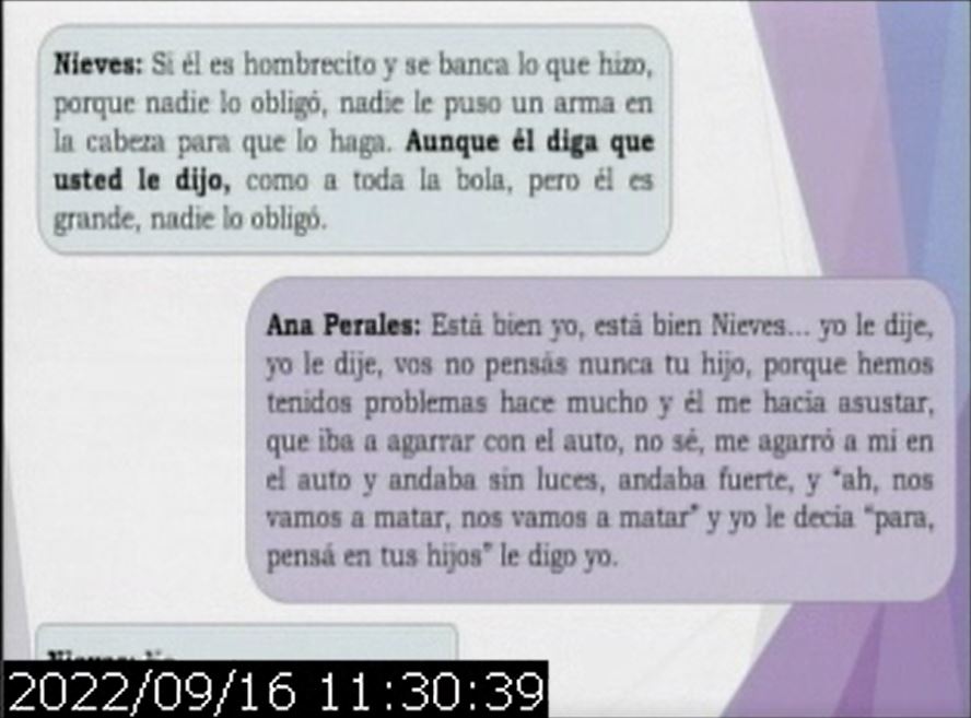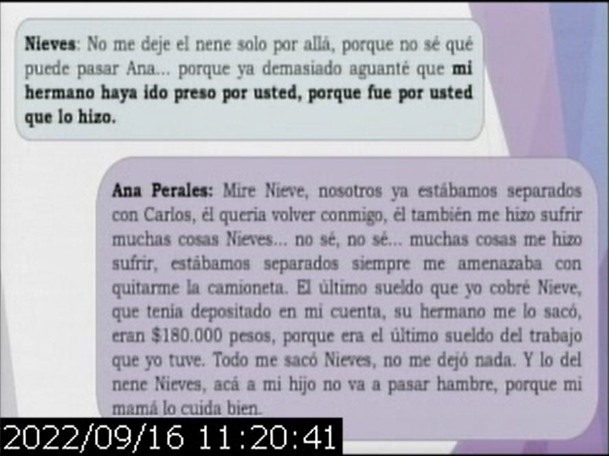Luego se reprodujeron los diálogos entre el femicida y su esposa, en la que ella le cuenta tramos de la charla que tuvo con Nieves, y hablan de la situación en la que están involucrados.