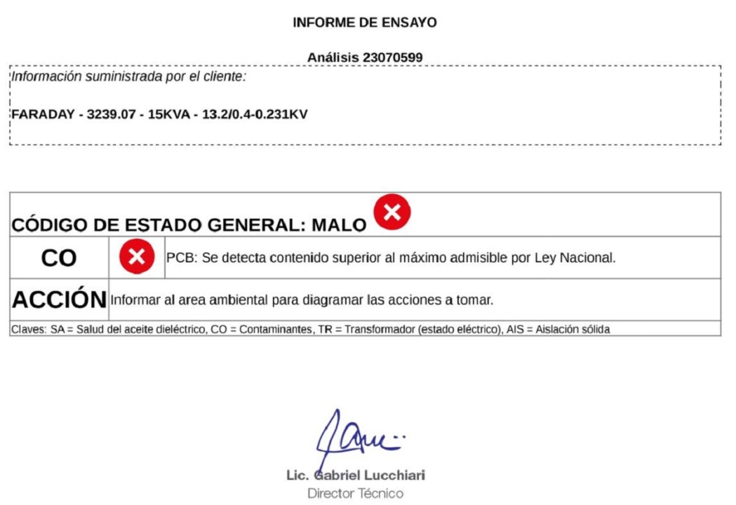 A los fines de la investigación, lo relevante de las pericias es que uno de los tres transformadores que fueron enterrados tenía 420 partes por millón de bifenilos policlorados, cuando el máximo permitido por ley es de 50.