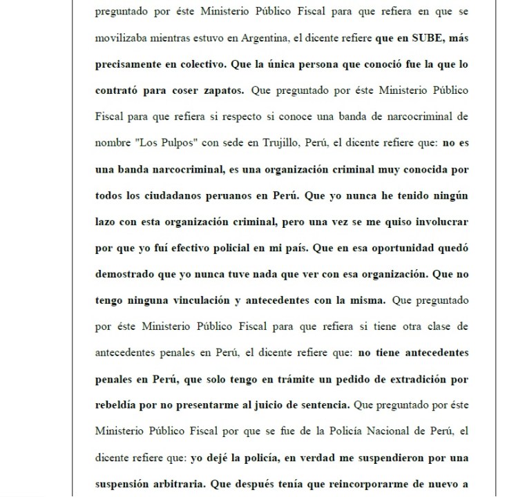 El acusado también negó pertenecer a la banda Los Pulpos de Trujillo, grupo narco señalado por informes de inteligencia como una red con la que habría tenido vínculos. “Nunca he tenido ningún lazo con Los Pulpos. Una vez se me quiso involucrar por haber sido policía, pero quedó demostrado que no tenía relación”, declaró. Además, contó que ingresó a la Argentina legalmente desde España, donde residió en Valencia, y que vivía en Lanús, “cosiendo zapatos y vendiéndolos en La Salada”.