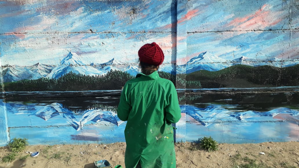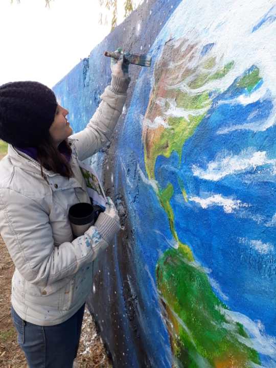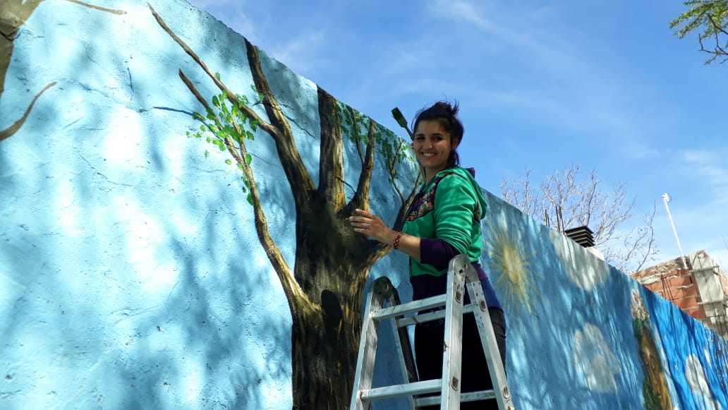 R: Mientras cursaba la carrera fui incursionando en pintar murales en interiores de casas, me fui animando a descubrir cómo me sentía cubriendo superficies cada vez más grandes y transformando espacios. En el 2004 realicé un curso «Transposición Didáctica de Muralismo», que me ayudó a seguir desafiándome y a seguir creando. Hasta el momento, hice aproximadamente 30 murales e intervenciones en Plottier, Neuquén, Villa Regina y China Muerta, tanto en espacios públicos como privados.