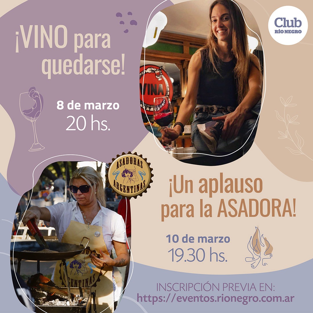 “Club Río Negro” organizó dos eventos, especialmente, para las mujeres de la región. El primero, “Vino para quedarse”, se realizó el lunes 8 de marzo y estuvo a cargo de la sommelier Sofia Maglione. Y el segundo, “Un aplauso para la asadora”, estuvo a cargo de la asadora Sandra Honczar y se pudo ver a las 19,30 en las redes de RÍO NEGRO.