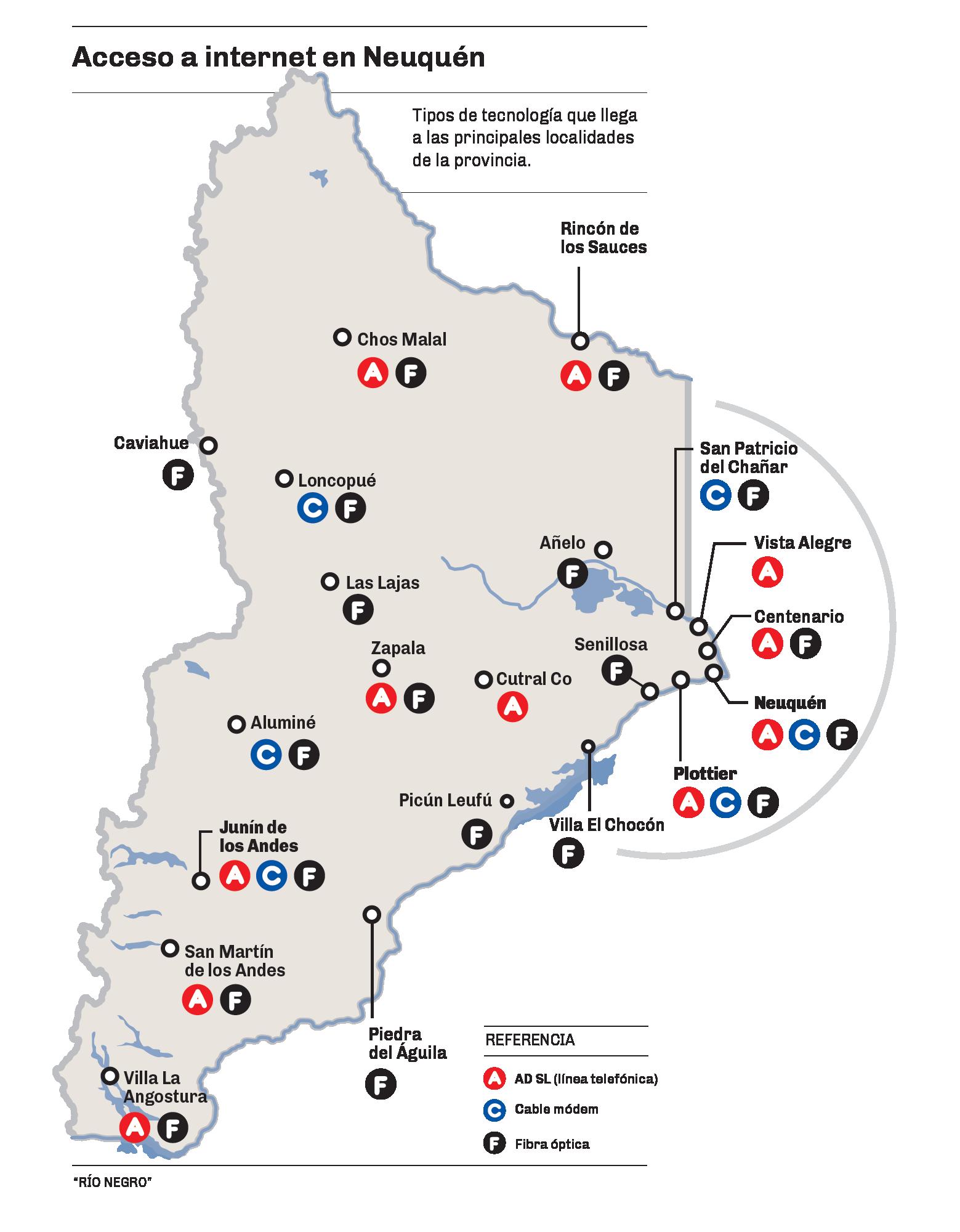 Según los datos disponibles en la Enacom, seis ciudades de la provincia tienen conectividad a través de cablemódem. Hay 11 que tienen servicio por ADSL. Sólo tres disponen de ambas opciones: Neuquén, Plottier y Junín de los Andes. El escenario se completa con la fibra óptica –que va adquiriendo mayor presencia conforme avanza el plan federal iniciado en 2009– y el servicio satelital.