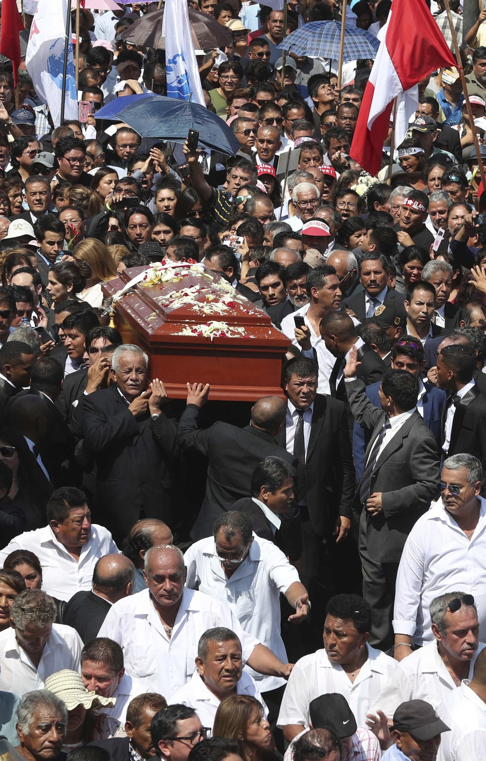 Poco después, miles de simpatizantes procedentes de todo el país siguieron por las calles de Lima el féretro del expresidente. El ataúd salió del local central del partido y, de acuerdo al programa, luego de recorrer las calles capitalinas será llevado hasta un cementerio de la zona este de Lima donde será cremado en otra ceremonia privada.