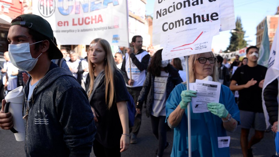 Los trabajadores del Centro Atómico Bariloche, Instituto Balseiro, Universidad de Río Negro y del Comahue, INTA, Agricultura Familiar, entre otros organismos formaron parte de la protesta.