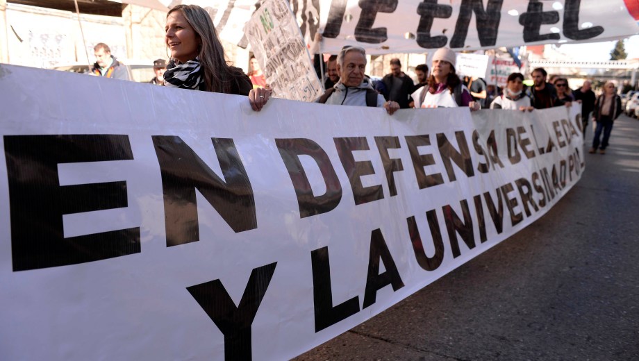 “Diagnóstico: 2000 investigadores fuera del Conicet”, rezaba uno de los carteles que un joven con guardapolvo blanco, mientras que otros aludían a la educación: “Yo no caí en la Universidad Pública… yo la elegí”, indicaba otro, mientras que una mujer portaba un afiche con la consigna “es nuestra ciencia, no tu empresa”.