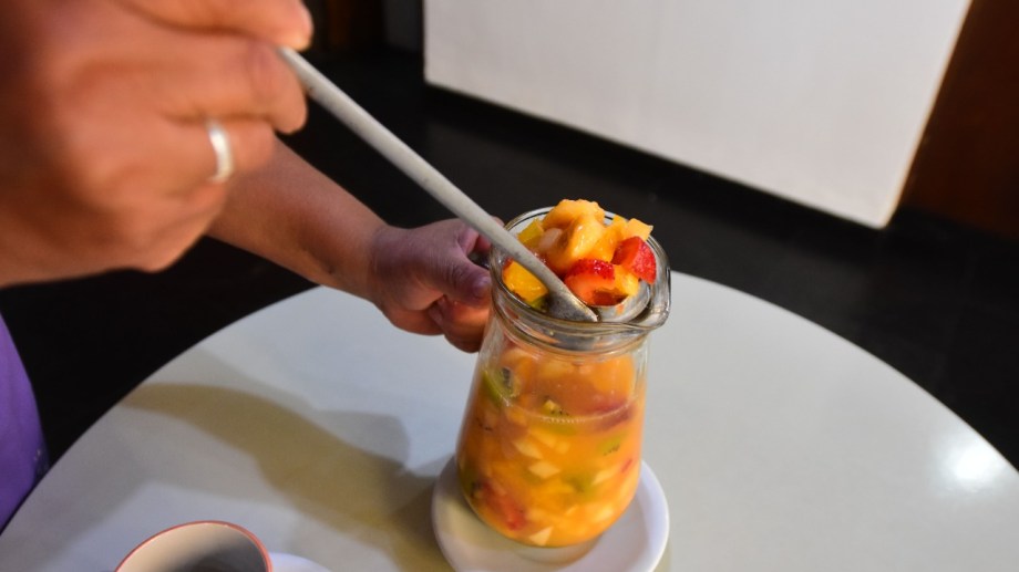 En cuanto a las frutas que usa señaló que elige unas cinco frutillas grandes, dos naranjas, dos bananas, pera, durazno en lata, kiwi y manzana. Toda la fruta la pica en cubos de un centímetro.