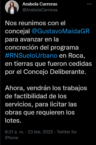 «Roca se suma al programa Suelo Urbano. Agradecemos a Gustavo Maida y esperamos prontamente poder beneficiar a familias que sabemos que están esperando un lote con servicios«, replicó Rodrigo Buteler, el Ministro de Gobierno de Río Negro.