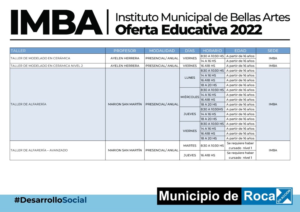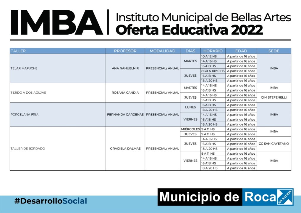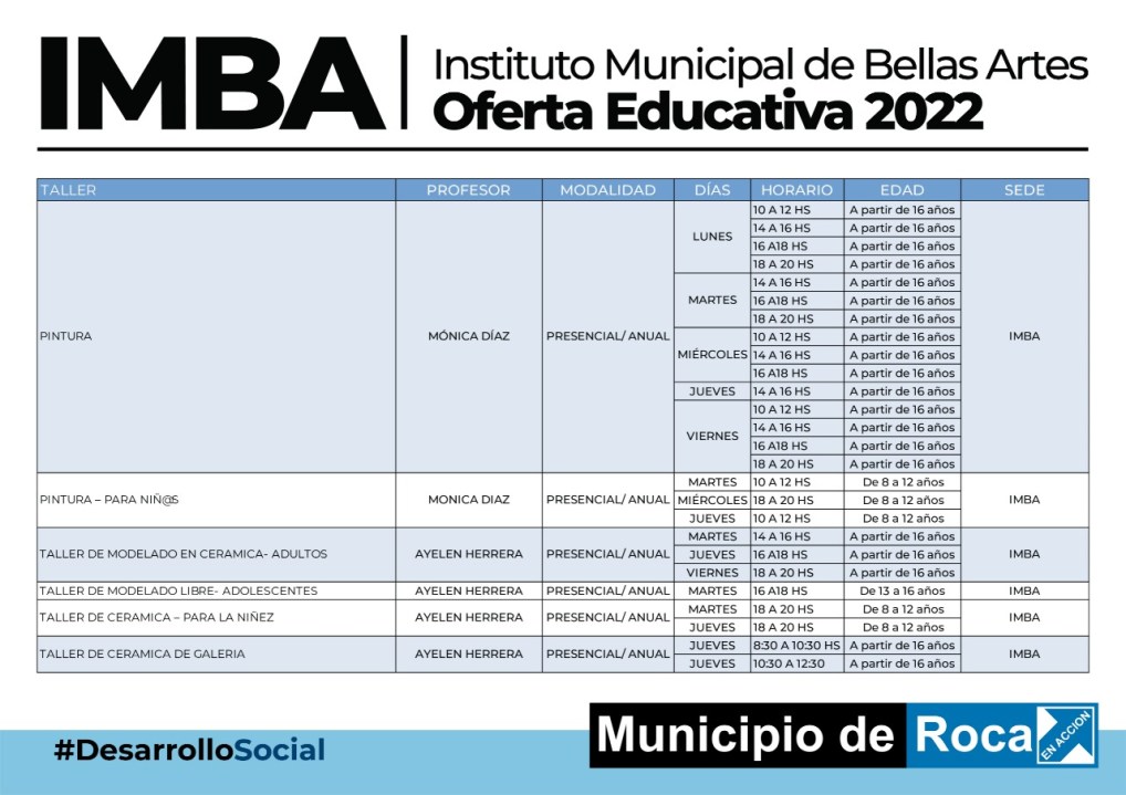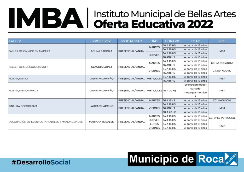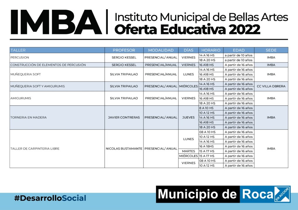 En tanto, el detalle de la propuesta pedagógica de cada taller se puedo observar en el siguiente link: https://www.generalroca.gov.ar/i-m-b-a-oferta-educativa-2022/