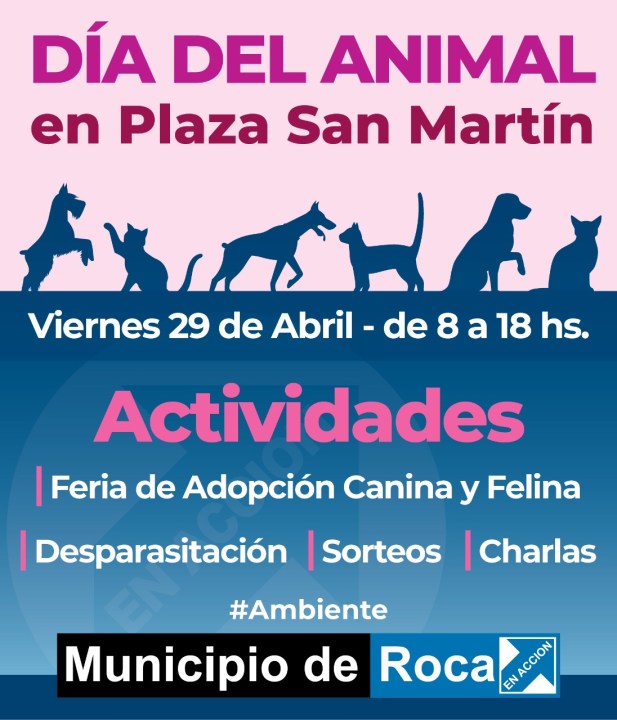 El municipio de Roca invita a la comunidad a participar de los festejos del Día del Animal. De acuerdo a lo informado, el evento se realizará este viernes de 8 a 18 en la plaza San Martín.
