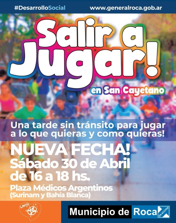 Este sábado tendrá lugar una nueva edición del Salir a Jugar. El municipio de Roca junto al Conya llevan adelante la actividad en la plaza Médicos Argentinos, ubicada en Surinam y Bahía Blanca en barrio San Cayetano.