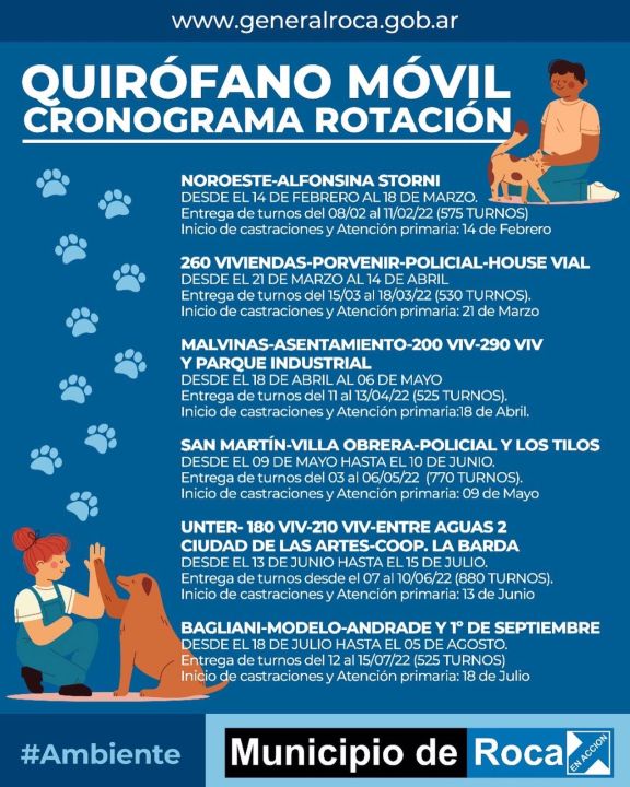 En tanto, el quirófano móvil continuará por los distintos barrios según el siguiente cronograma: